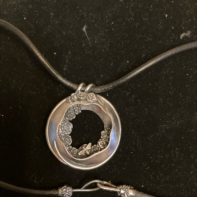 Silver open lentil pendant decorated with roses and a bee. The pendant is strung onto leather and fastened with a handmade silver clasp also decorated with roses.