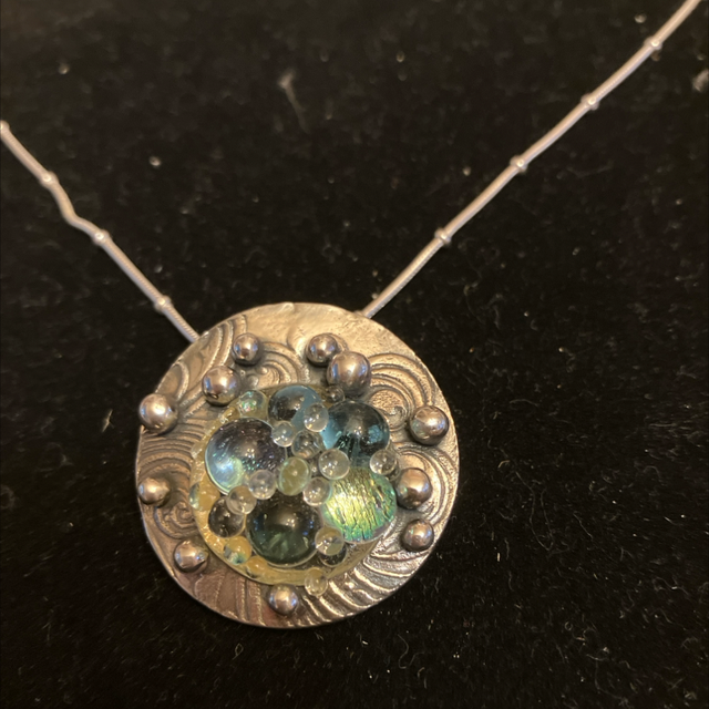 silver bubbles surround an amazing glass cabochon which is full of shimmering glass bubbles