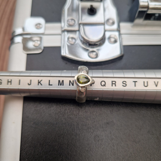 Ring has been green pear cubic zirconia and two clear cubic zirconias